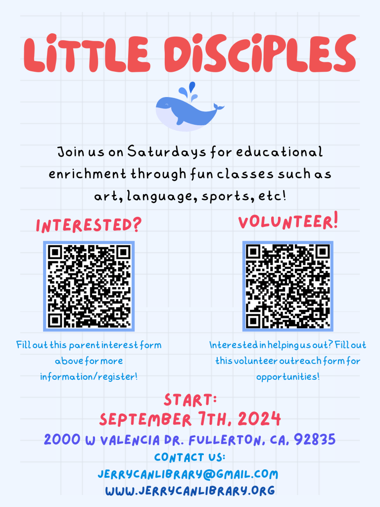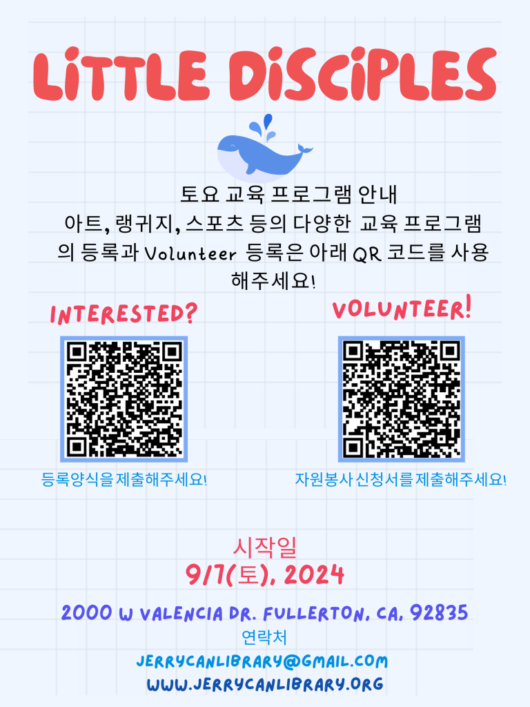 Jerrycan 도서관은 남가주 꿈이 있는 교회에서 시작된 작은 도서관입니다. Jerrycan 도서관은 지역 커뮤니티에 신앙 기반의 유익한 책들을 제공하는 동시에 우간다의 도서관으로 기부금을 보내는 것을 목적으로 설립되었습니다. Jerrycan 도서관은 Spanish for Kids 그리고 Little Disciples 이라는 프로그램을 운영해왔습니다.